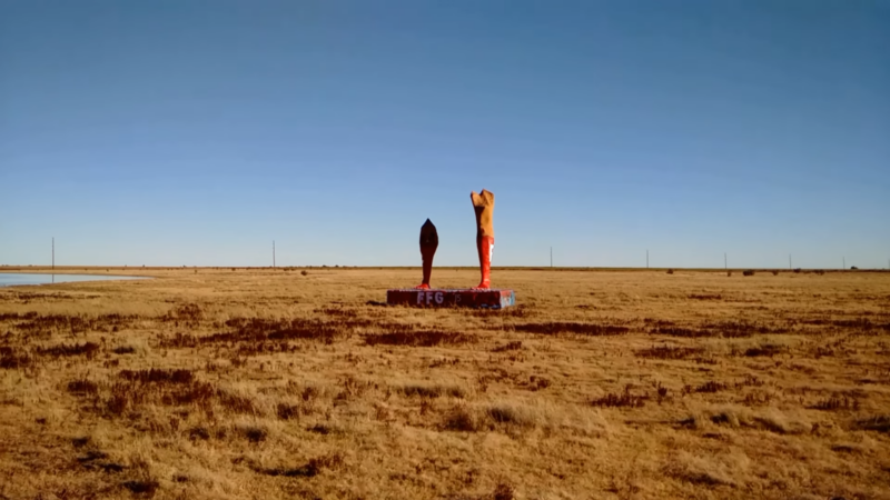 “Ozymandias On the Plains” is an unusual roadside sculpture in Amarillo that depicts two massive, broken legs, a nod to the famous poem. The statue is uniquely adorned with sports socks, blending ancient and modern themes.